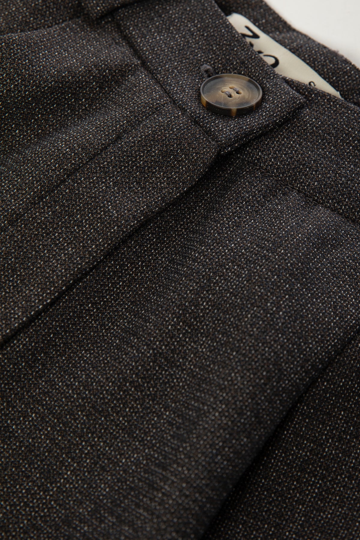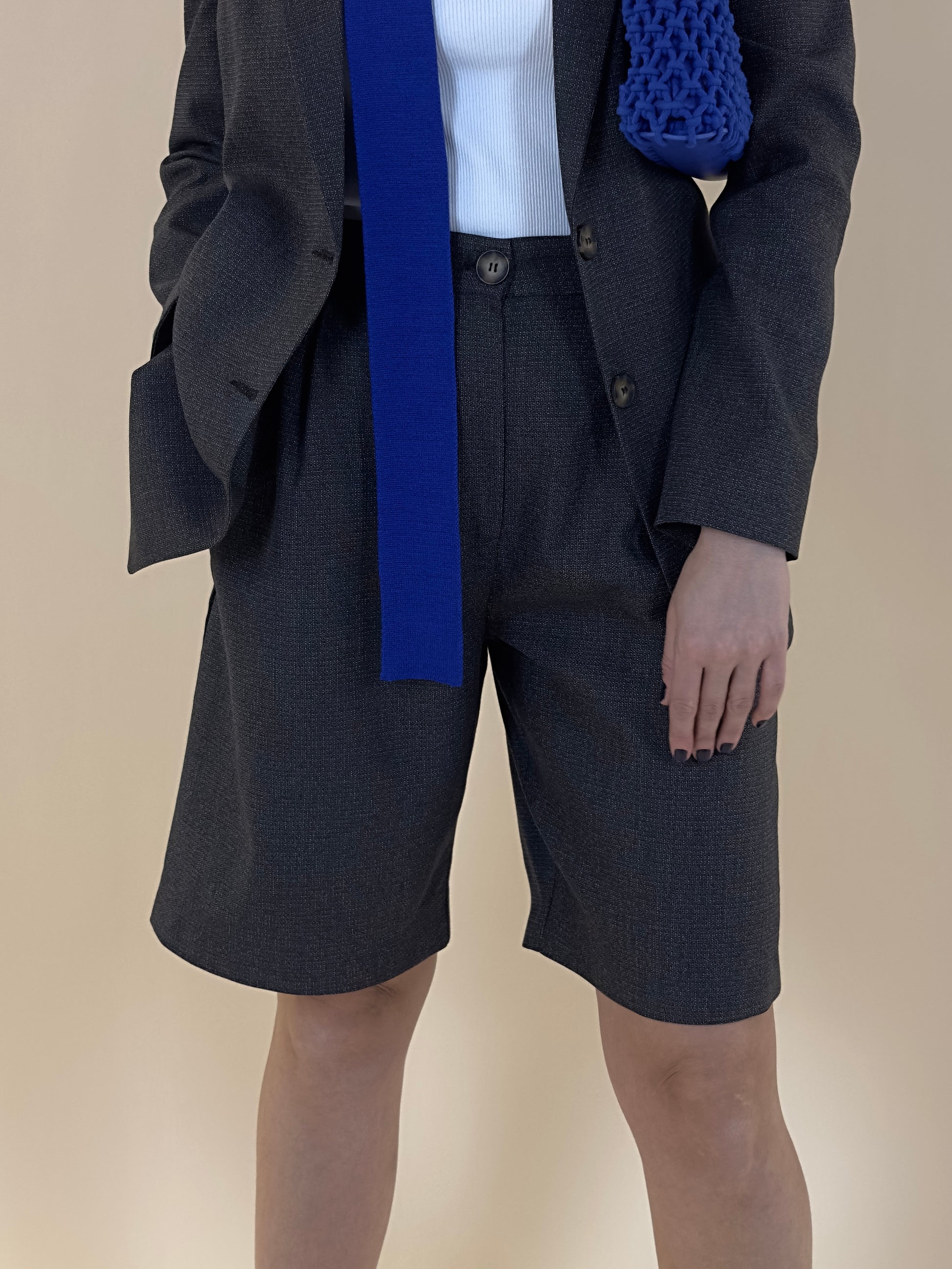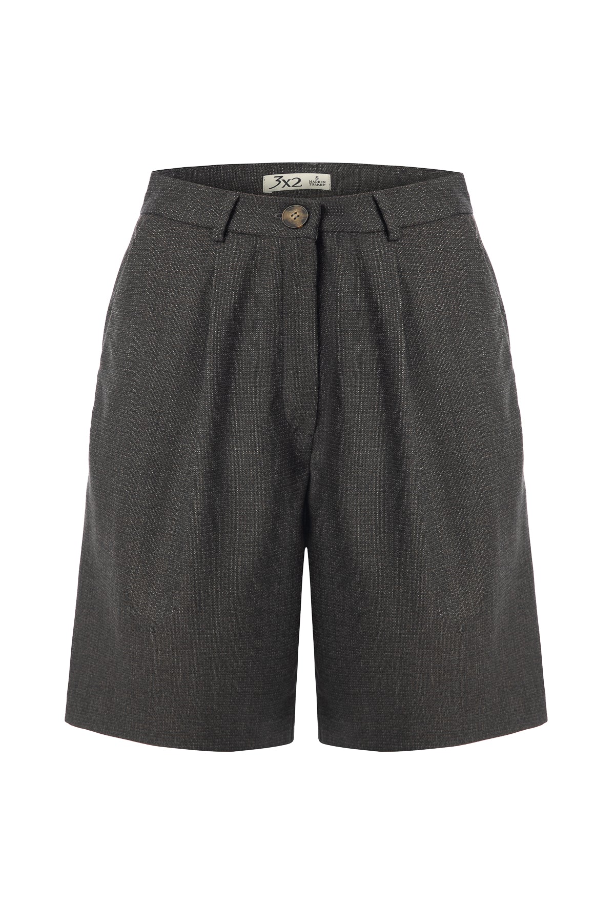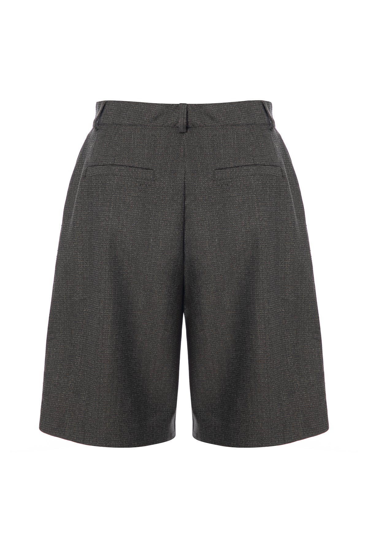 Diz üstü boyu, yan ve arka cep detayları ile dokulu kumaş pileli bermuda şort.
