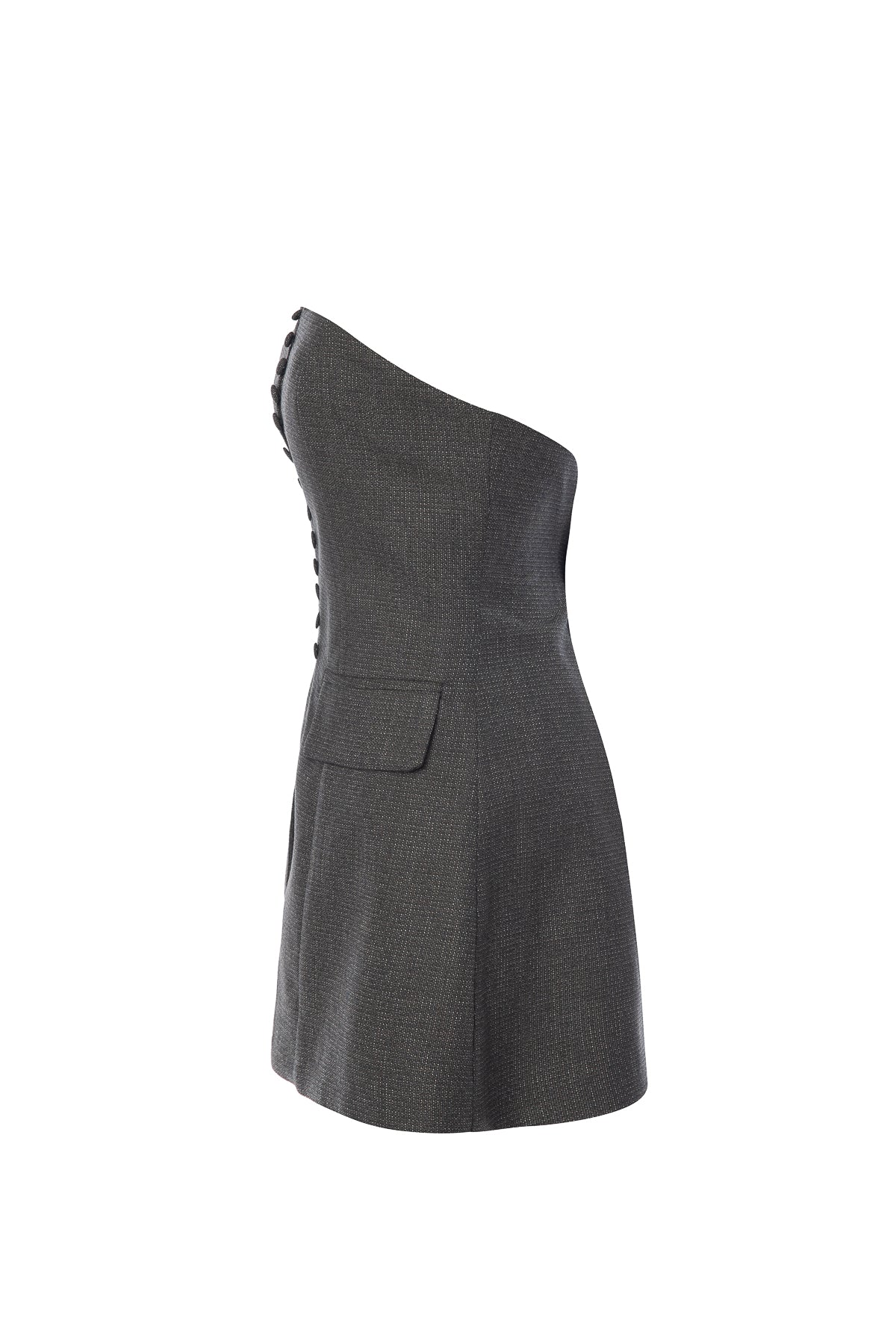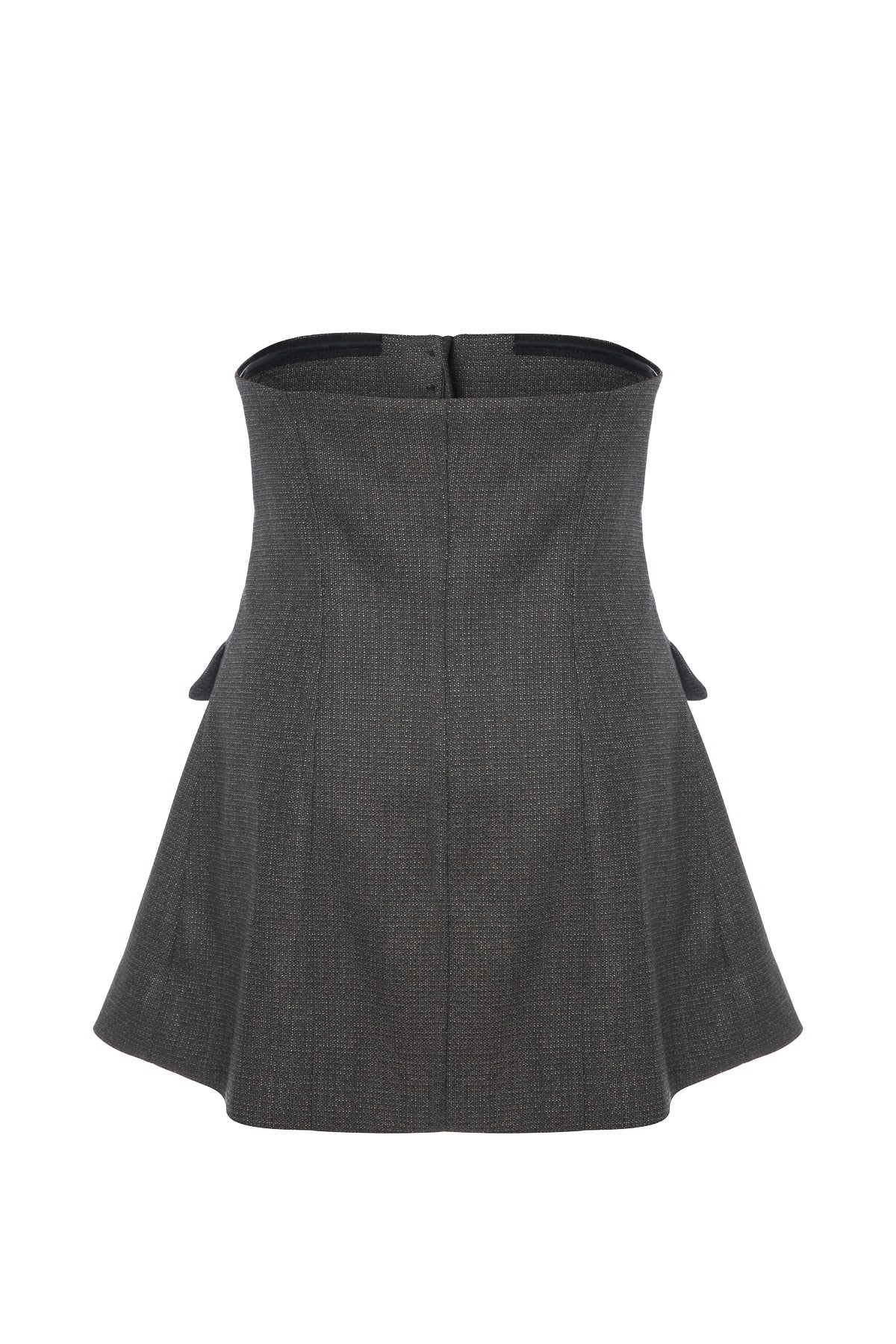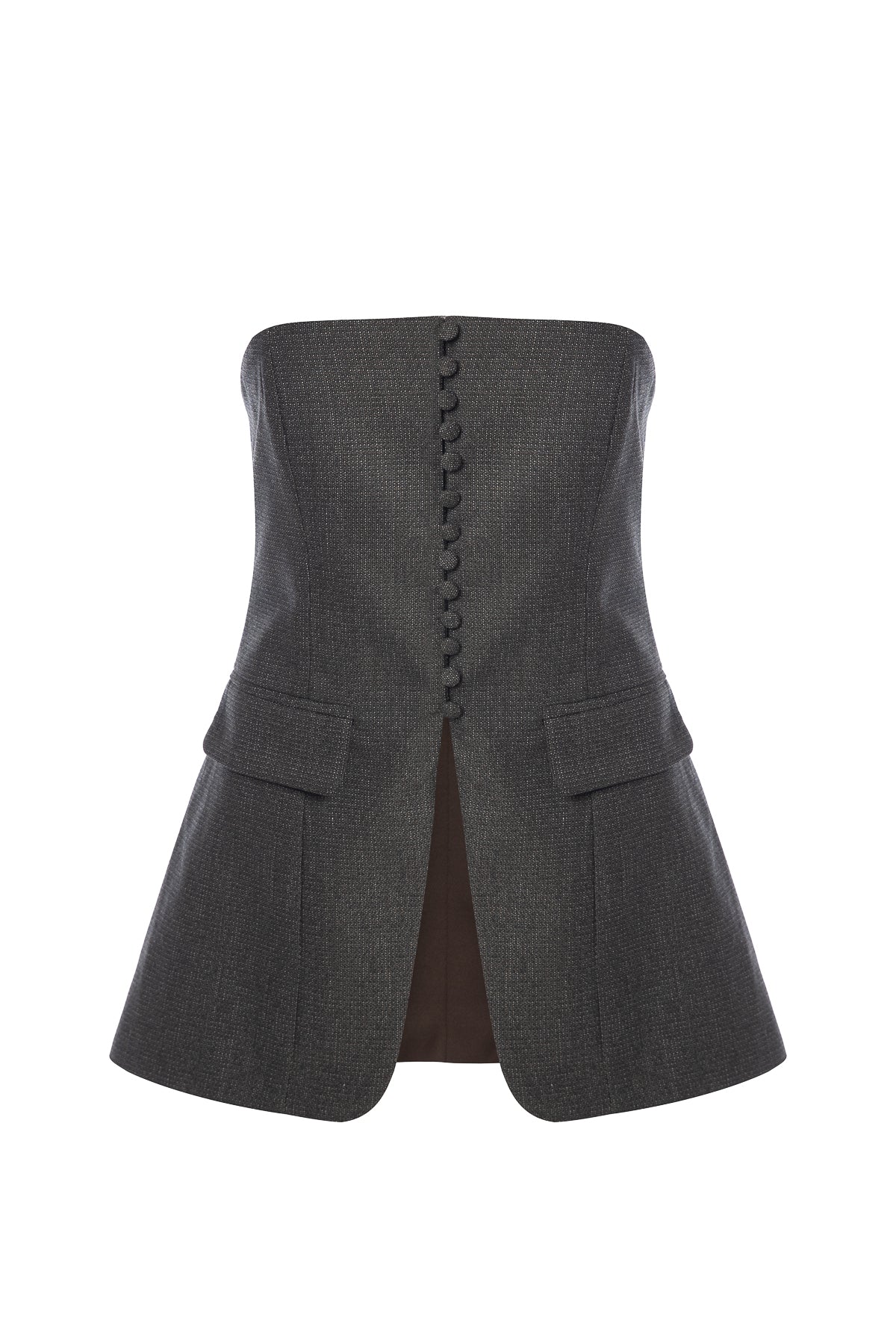 Önden düğme kapamalı, straplez formda yanda iki cep detaylı büstiyer.