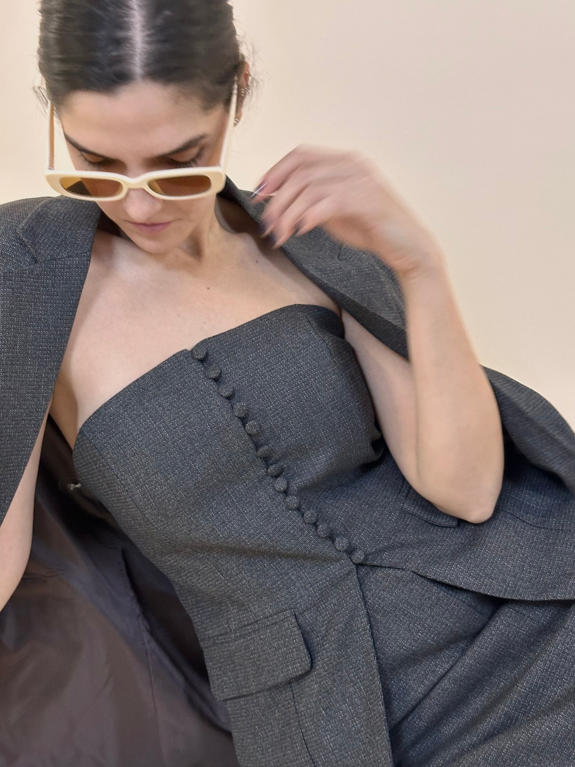 "not regular" kapsül koleksiyonunun çıkış noktalarından biri olan ceketten bozma büstiyer, maskülen feminenliğin 90lar ofis şıklığı hali diyebiliriz.