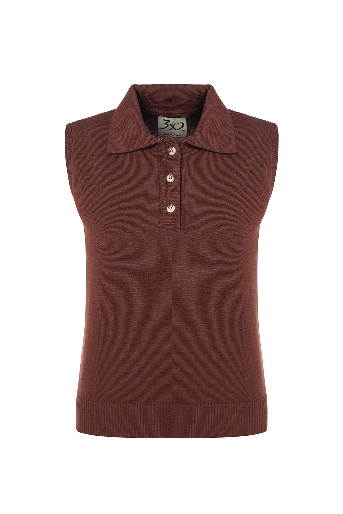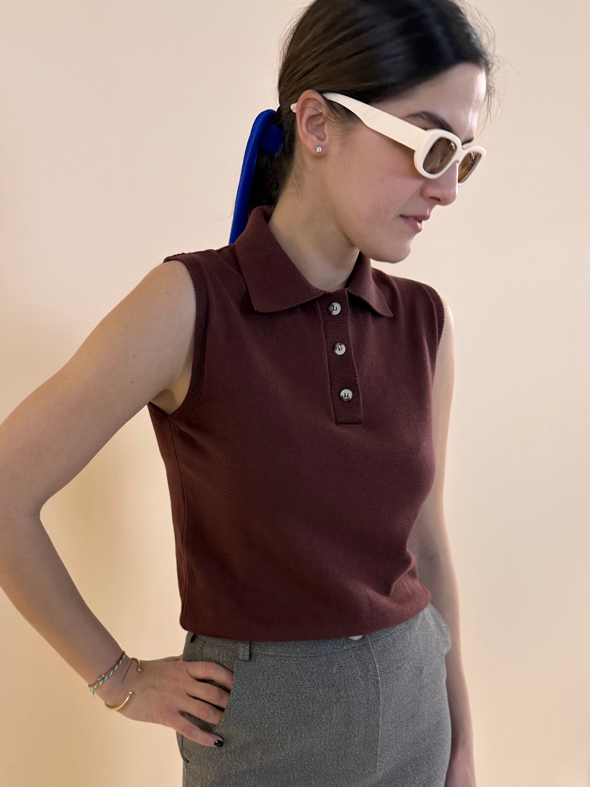 Kemik düğmeleri ile natürel görünümlü kolsuz polo yaka triko bahar günlerinin her ortama uygun anahtar parçası olmaya aday.